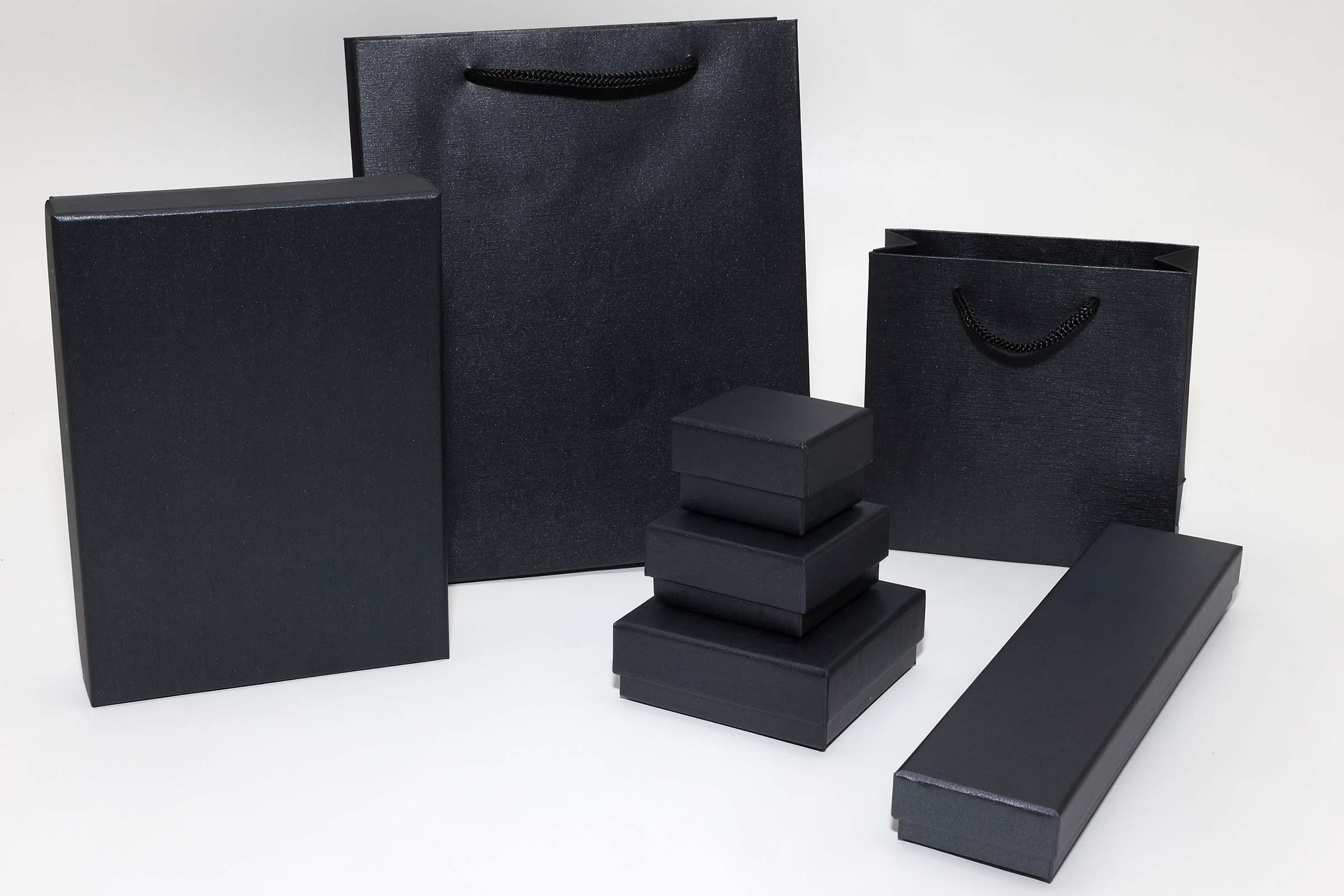Astucci fondo e coperchio in cartoncino rivestiti in carta perlata nera, interni in gommapiuma floccata nera. Forniti di busta in tinta.