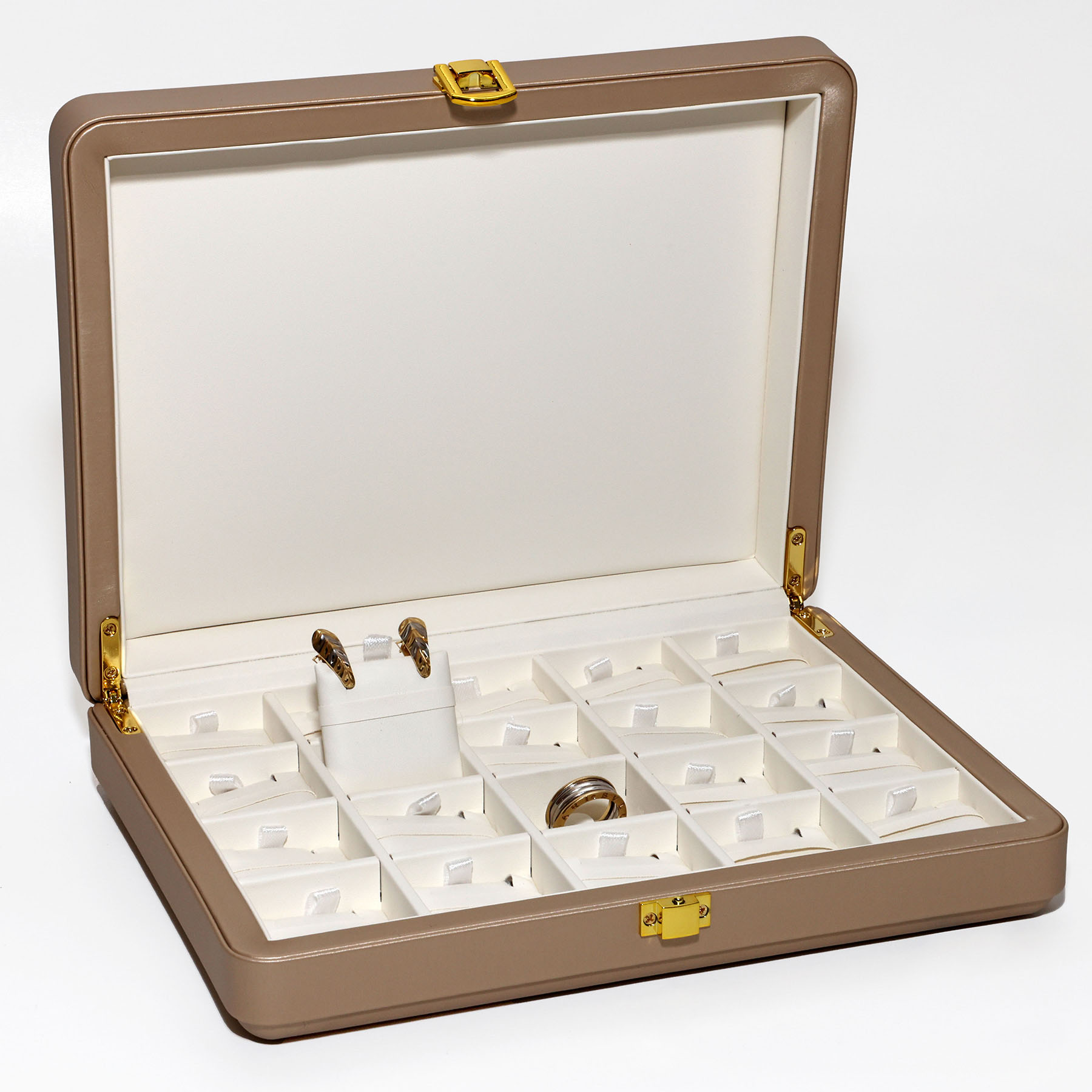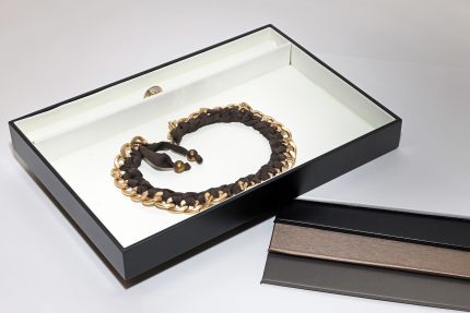Elegante marmotta con chiusura in metallo dorato. Interno multiuso in pelle bianca.