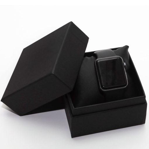 Astuccio per orologio in cartoncino nero con chiusura ad incastro, interno cuscino similpelle, fornito di fascette in tinta.